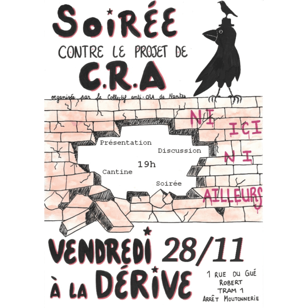 Le collectif anti-CRA de Nantes vous invitent à une soirée de rencontre à la Dérive autour de la lutte contre la création du CRA à Nantes. Debut de la soirée à 19h, présentation du collectif, discussions pour celleux qui veulent et soirée :